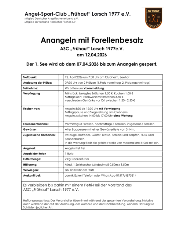 Der ASC Frühauf gibt ab sofort eine begrenzet Zahl an Jaheslkkarten an interssierte Angler.